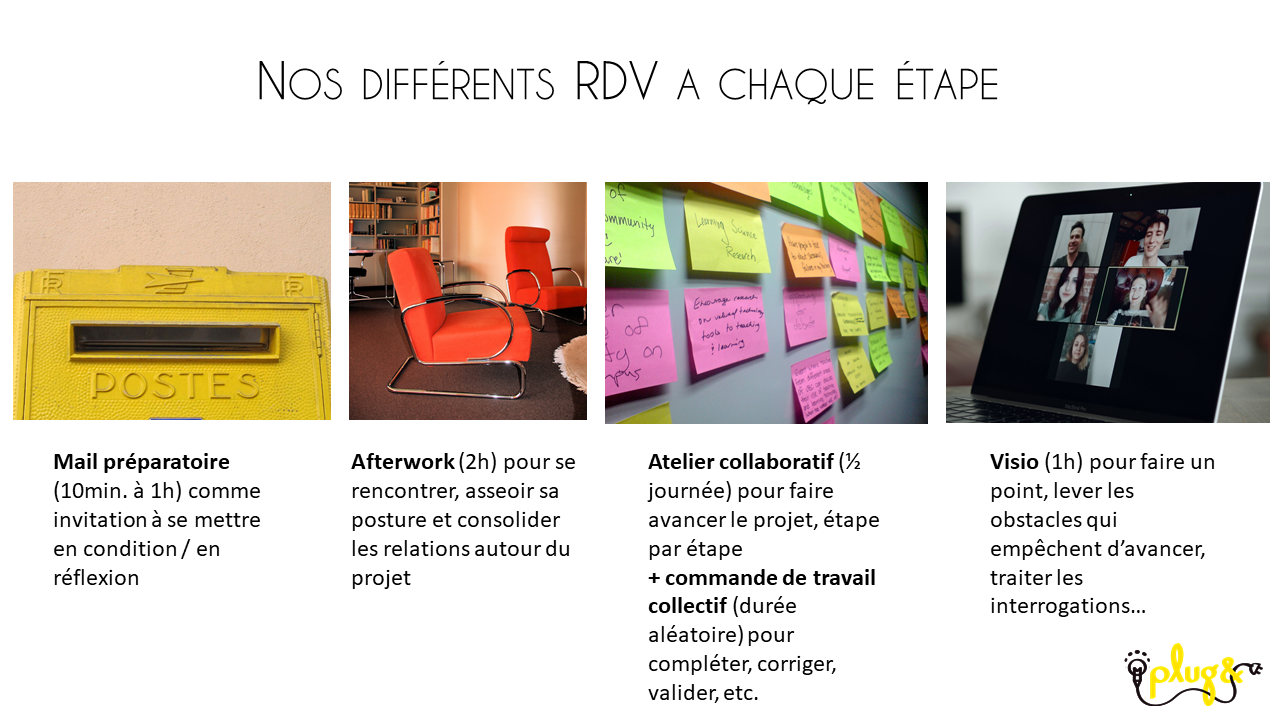 Les modalités d’intervention que nous vous proposons ont été éprouvées à plusieurs reprises et offrent la possibilité de varier réflexion collective et réflexion individuelle, travail synchrone en face à face et travail asynchrone à distance. Elles offrent une variété de possibilités de se mobiliser sur le projet de façon continue, dans le cadre d’une démarche structurée et cadrante.